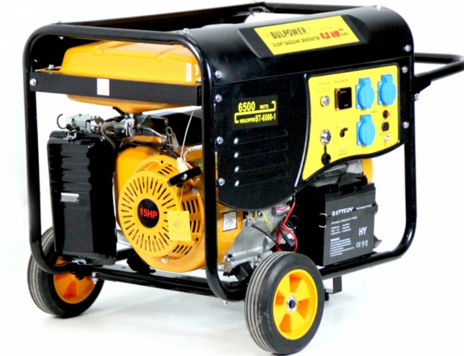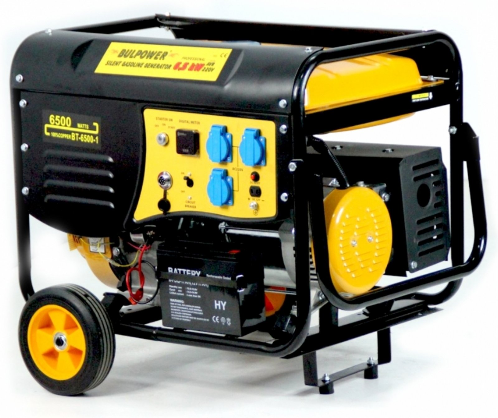 Бензинови монофазни/трифазни  генератори за ток BP 6.5 kW BULPOWER PROFESSIONAL с вградена aвтоматика + дигитален дисплей + автоматично зарядно за акумулатора + транспортна количка. Генераторите са с медни ротори и статори и са оборудвани с автоматичен смукач, Двигател: GX 860 с въздушно охлаждане, 16 конски сили, работна честота: 50 Hz. Вграден AVR /Automatic Voltage Regullator/: вградена платка за автоматично регулиране и стабилизиране на напрежението- могат без проблем и без никакви смущения да работят всякакви прецизни електроуреди като LED, LCD и Plasma телевизори, компютри, непрекъсваеми захранвания (UPS-и) и много други подобни. Автоматичен предпазител против претоварване на генератора, магнетен стартер и автостартер с ключ и акумулатор, транспортна рамка с колела и дръжки за по-лесно предвижване на генератора. Генератора има вграден дигитален дисплей показващ изходящият моментен волтаж и отработените моточасове + 1 броя изходи за 230V, един изход за 380V и един за 12V. Разход: 450 грама литра бензин на киловат час, при пълно натоварване. Размери: дължина 71 см. без дръжки и 109 см. с разпънати дръжки, ширина 54 см. без гуми и 66 см. с гумите, височина 58 см. без гуми и 66 см. с гумите. Тегло без гориво – 95 кг. Гаранция: 24 месеца. Гаранционен и следгаранционен сервиз.