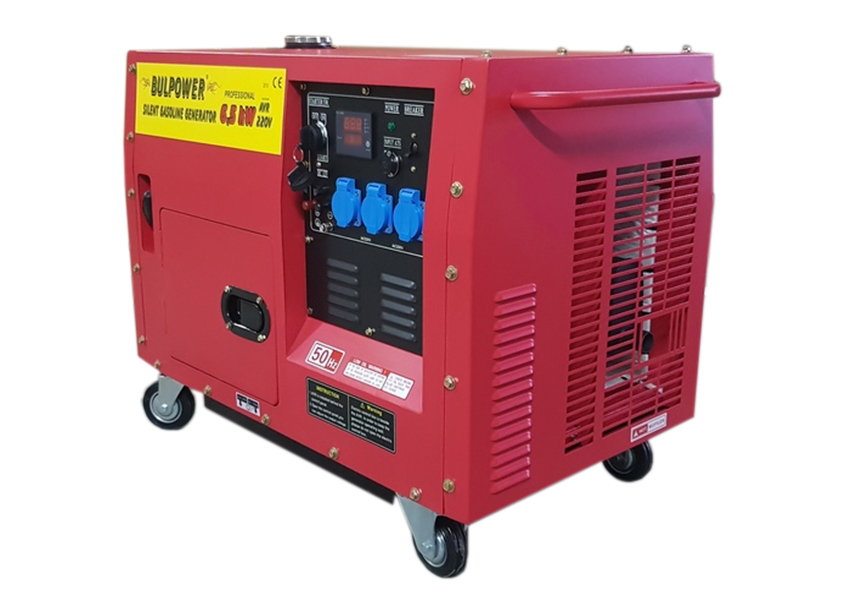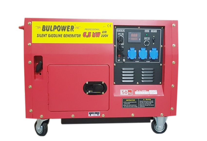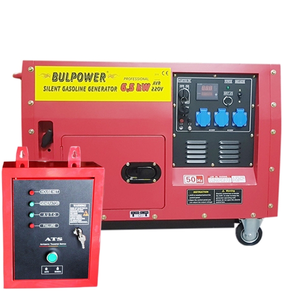 Предлагаме Ви, новите обезшумени и водозащитени бензинови четиритактови генератори 6.5 KW Bulpower, пълна автоматика за монофазен ток. С пълна автоматика и автоматично старт-стоп табло с контакторна група, които служат за напълно автоматичното стартиране/спиране на генератора при отпадане/възстановяване на основното ел. захранване. Гарантирано безотказно и без никаква човешка намеса. При прекъсване на електрозахранването, в автоматичното старт-стоп табло, управляващо генератора има монтиран вграден таймер, който прави три последователни опита за стартиране на генератора. Автоматичният таймер, след възстановяване на електричеството гаси автоматично генератора след 30 секунди. В управляващо табло има вградена изцяло автоматична двупосочна контакторна система, не позволяваща на генератора при отпадане на нормалното електричество и при включване на режим генератор да се върне ток към електропреносната мрежа. И обратно – при възстановяване на нормалното електричество спира автоматично подаването на ток от генератора към електрическото табло.