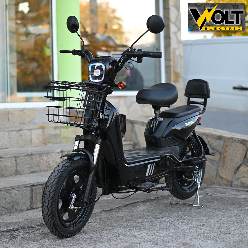 Двуместен електрически скутер- велосипед с педали BULLMAX BUZZ. с големи 16″ джанти, 750W максимална мощност на двигателя, 220кг. товароносимост, 50+ км. пробег. Не е необходима шофьорска книжка и регистрация в КАТ.