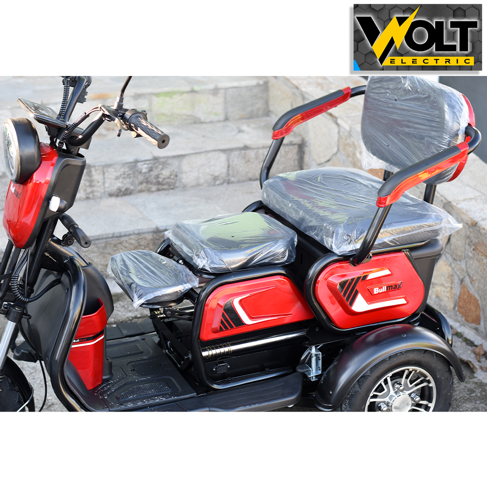 Електрическа триколка Bullmax C1. Триколката е с дигитален LCD светещ дисплей с показания за скорост, изминато разстояние, ниво на батерия, светлини и др, три нива на скоростта. Предна и задна ръчни спирачки, удобна крачна спирачка. Пълна LED ветлинна окомплектовка- фар Angel Eye, предни и задни мигачи, стопове. Голям заден багажник с ключалка. Триколката е с вградена втора седалка за допълнителен пасажер, която се появява отдолу, когато се премести основната седалка назад, както и трета малка седалка отпред, за дете, която може да се сгъва надолу и не пречи, когато не се използва.