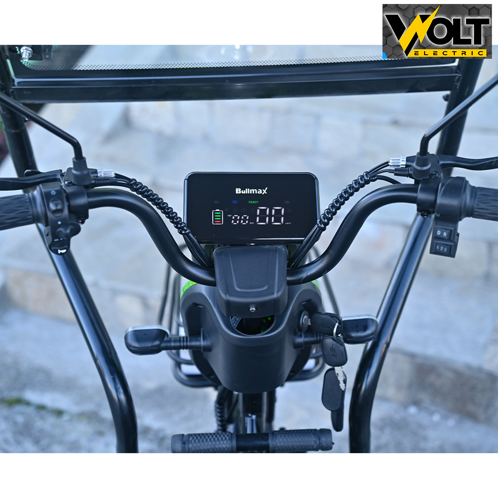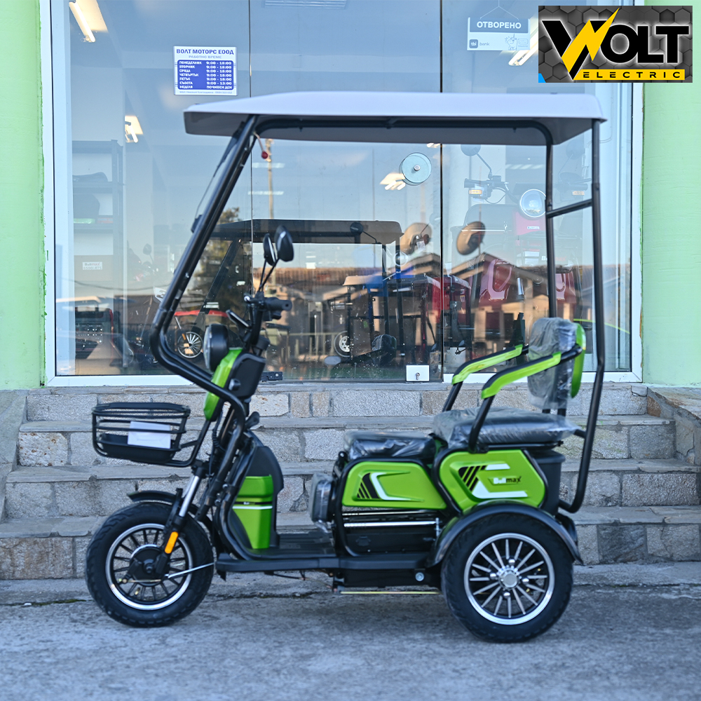 Електрическа триколка с 1, 2 или 3 местна конфигурация на седалките. Задно разположен електродвигател с диференциал, подходящ за изкачване на стръмни участъци. Товароносимост- до 230 кг, пробег- до 50км. с пълно зареждане /може да варира според терена и теглото/. Покривна конструкция с предно стъкло и найлонови страници, позволяваща употреба при лошо време. Големи 10″ алуминиеви джанти, с по- висока проходимост, подходящи за черен път и неравни участъци.
