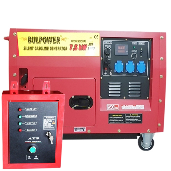 Предлагаме Ви новите обезшумени и водозащитени генератори пълна автоматика 7.5 KW. Бензинови четиритактови генератори Bulpower, с пълна автоматика и автоматично старт-стоп табло с контакторна група, които служат за напълно автоматичното стартиране /спиране на генератора при отпадане/възстановяване на основното ел. захранване. Гарантирано безотказно и без никаква човешка намеса. При прекъсване на електрозахранването, в автоматичното старт-стоп табло, управляващо генератора има монтиран вграден таймер, който прави три последователни опита за стартиране на генератора. Автоматичният таймер, след възстановяване на електричеството гаси автоматично генератора след 30 секунди. В интелигентното управляващо табло има вградена изцяло автоматична двупосочна контакторна система, непозволяваща на генератора при отпадане на нормалното електричество и при включване на режим генератор да се върне ток към електропреносната мрежа. И обратно – при възстановяване на нормалното електричество спира автоматично подаването на ток от генератора към електрическото табло.